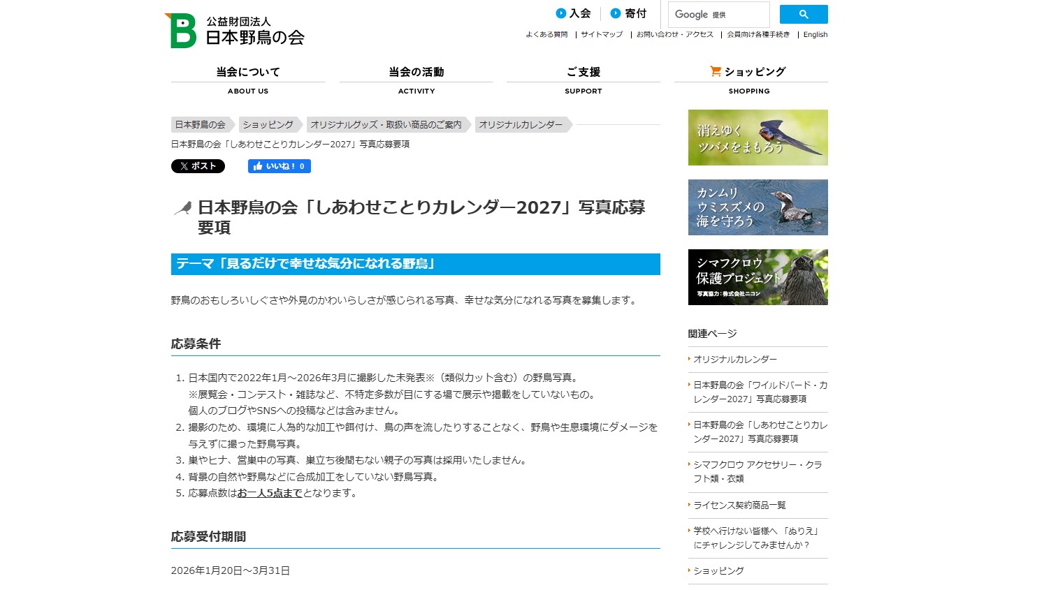 ※画像:公式サイトのキャプチャー日本野鳥の会「しあわせことりカレンダー2027」写真募集