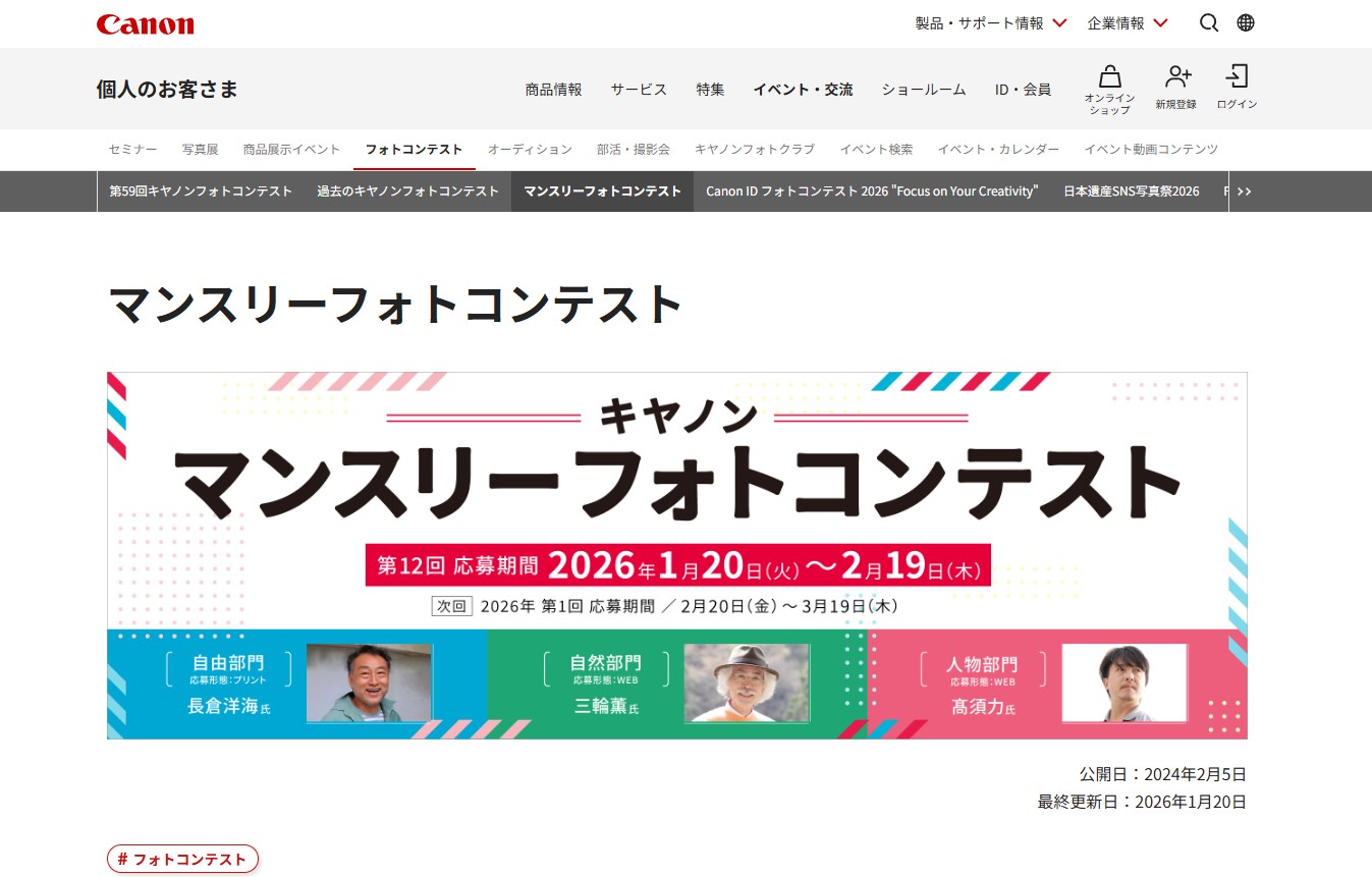 ※画像:公式サイトのキャプチャー2026年 第12回 キヤノン マンスリーフォトコンテスト