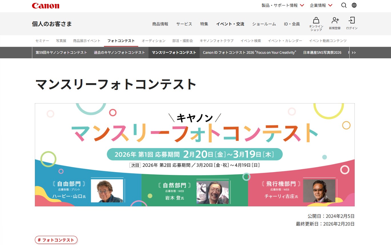 ※画像:公式サイトのキャプチャー2026年 第1回 キヤノン マンスリーフォトコンテスト