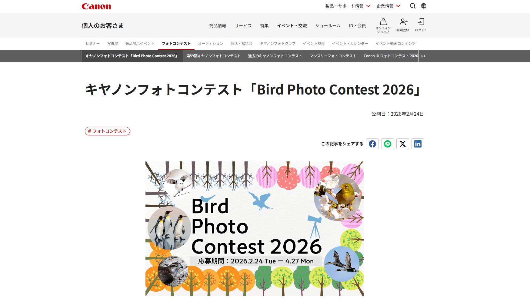 キヤノンフォトコンテスト「Focus on Bird 2026」を、2026年2月24日(火)〜4月...