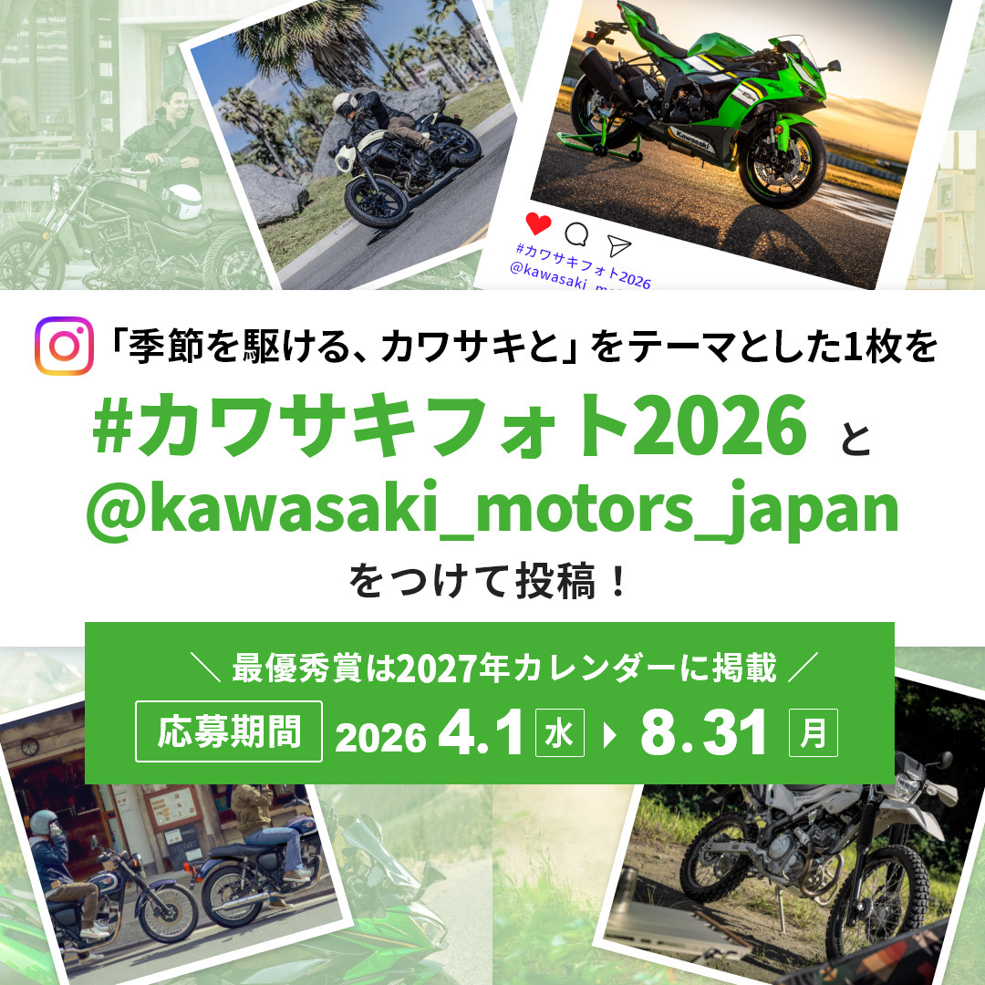4/1(水)~8/31(月)までの期間中、Instagramで「季節を駆ける、カワサキと」をテーマとする『カワサキフォトコンテスト2026』を開催いたします!